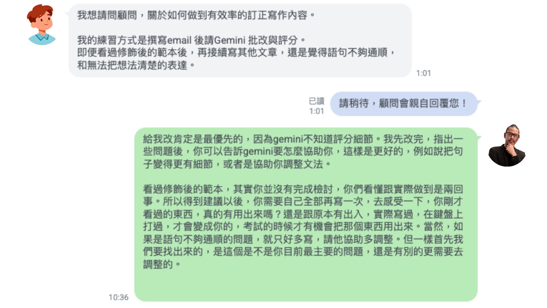也就是說,利用AI,修正自己的文法錯誤、讓句子更通順,又或者練習例子的發展;解決明確的單一問題,是我覺得最好的做法。調整完之後,再由老師來做大方向,也就是針對新制托福寫作的建議和評分,才是最有效的方法。